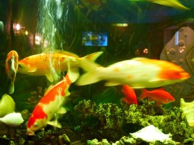 Wir bestellten Zander und Victoria-Barschfilet und bekamen nach angemessener Zeit, was auf frische Zubereitung schließen lässt, große, gut gefüllte und appetitlich angerichtete Glasplatten in Fischform serviert. Es schmeckte ausgezeichnet, die Bedienung war sehr freundlich, im großen Aquarium schwammen große Fische hin und her und von der Bowlingbahn hörten wir fröhliche Stimmen.